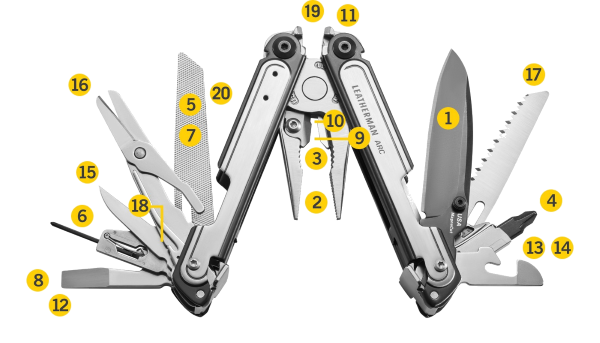 20 gereedschappen: MagnaCut-mes van 70 mm, puntige tang, standaardtang, houder voor brede bits, diamantvijl, houder voor kleine bits, hout-/metaalvijl, hefboom, vervangbare hoogwaardige draadkniptang, vervangbare hoogwaardige kabelkniptang, slagvlak (hamer), Grote schroevendraaier, Flesopener, Blikopener.